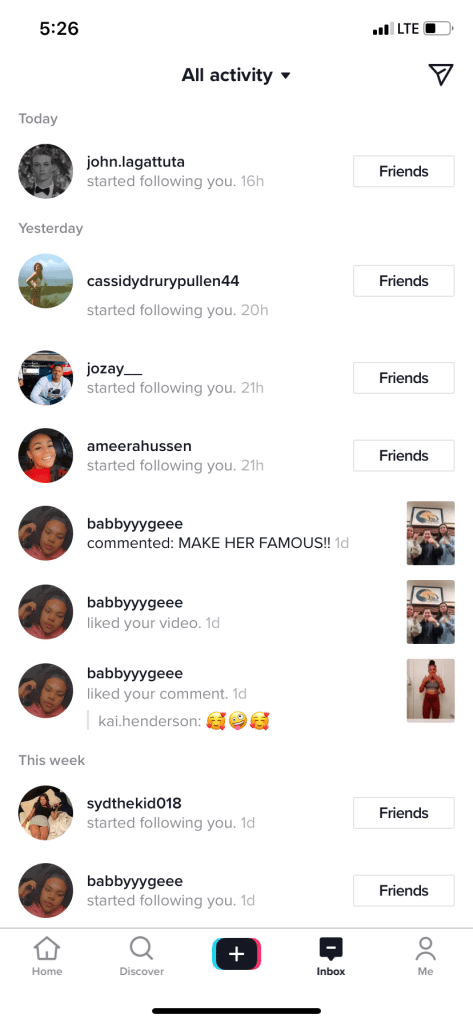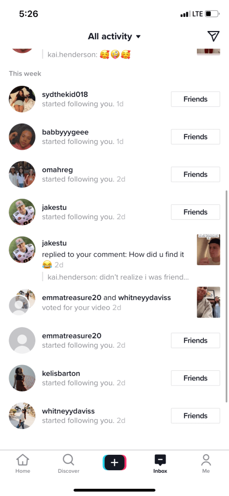 After creating my account just five days ago, I have gained 11 followers, or roughly 2 followers per day. While this is a meager start, for only having posted my first TikTok the same day I created the account, I think I am off to a great start! Immediately after creating this account I went straight to the “add friends” icon in the top left of the interface and added practically every contact I knew right off the bat with a few friends trickling in as followers as I went along. Then, I went to the following page and began following popular TikTokkers and influencers, making a point to like and comment on each of their videos I thought were worth a like.