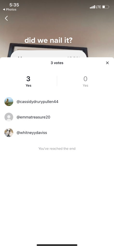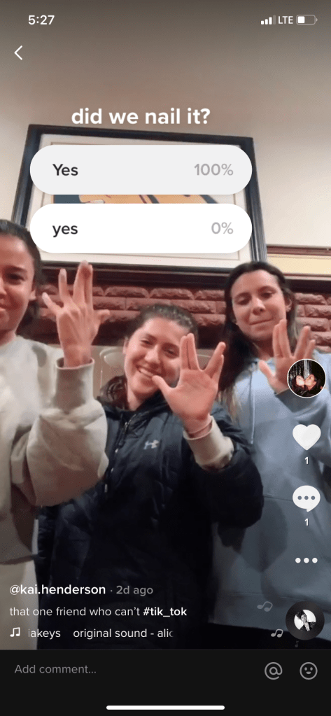 Utilizing the pre-made song, a filter, and a fun and interactive polling sticker, I had officially created my first piece of TikTok content! After posting, I seemed to get a few more followers from individuals I did not know personally, as well as some friends liking, engaging with my poll, and commenting on my post.