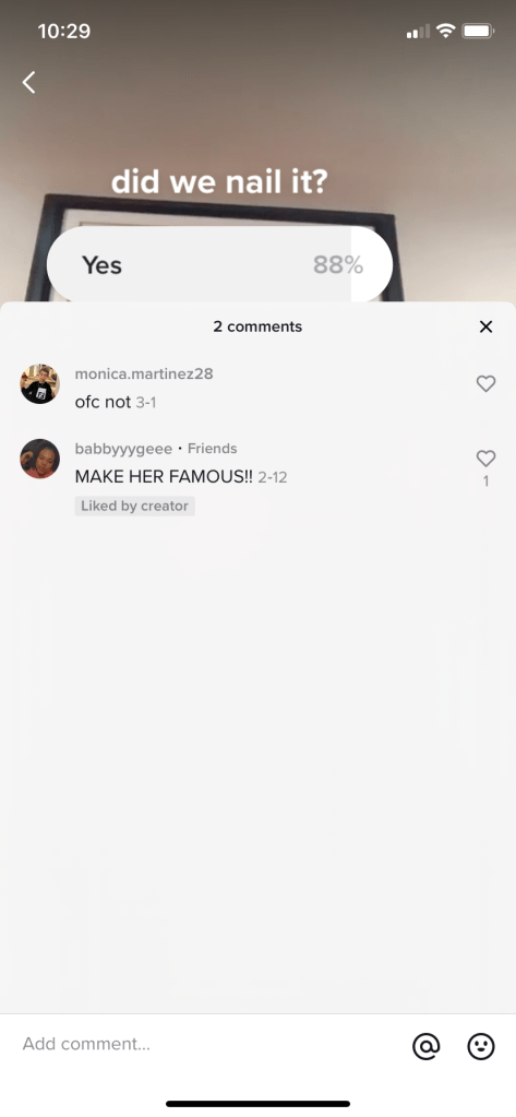 Along with my Tik Tok’s brief fame, I subsequently gained 11 followers and nearly a hundred more views on my previous Tik Toks from new followers, a substantial leap from a few weeks ago. When these new followers came as my video gained more views and likes, people I did not know (not my close friends who typically comment on my videos) began to comment on past Tik Toks like this one below.