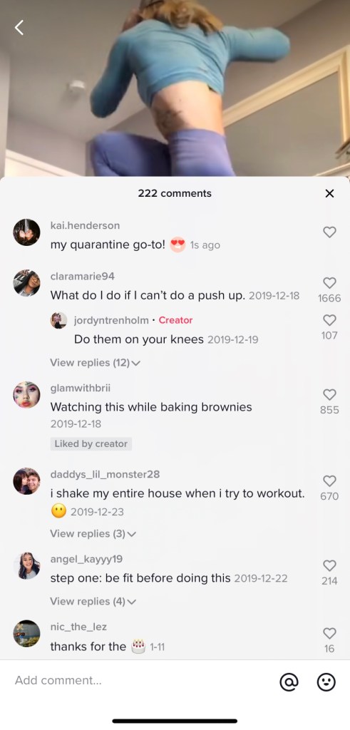 Since I posted the #youcanreallydance video, I have been actively engaging in other niche areas of Tik Tok besides classic humor, thus I have been particularly active on #healthyeating channels as well as #strengthtraining being I am quarantined in my home and still want to utilize my social media as best as I can. In doing so, I have been actively liking and commenting on fitness and food tutorials, and the Tik Tok algorithm has intuitively placed more of these videos on my popular feed. I plan on continuing to build more of a community around these videos and comment on other users’ comments for tips and advice as well!