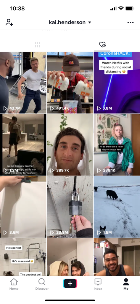In these following weeks to come where I will be all by my lonesome, with just my dog to accompany me, I aim to not only spend a sickening amount of time on Tik Tok, but to do so with greater purpose. Being that I cannot see my friends in the physical space, I have made plans to use the “duet” feature of Tik Tok to collab with friends on the app and make joint videos. As you can see from my liked videos and repertoire of sounds to choose from, I plan to make a visual diary of my quarantined life through the use of trending sounds such as “It’s Corona Time” as well as comical effects to not only pass the time, but to as always: go #viral.