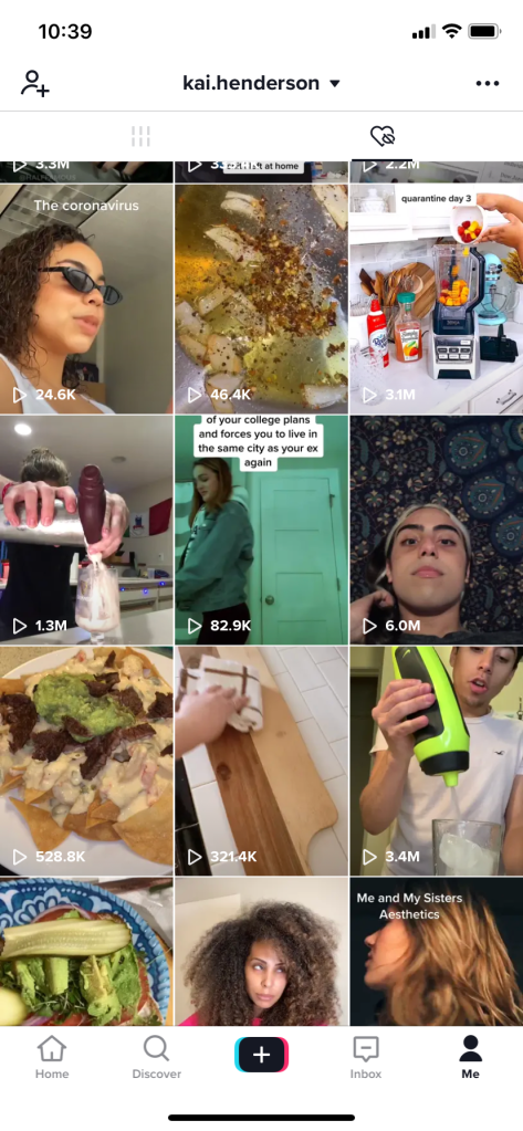 On Tik Tok, especially with this global pandemic, there seems to be a trend of users posting more “real” or relatable content about the Coronavirus and how they are coping with it. This is a clear shift from Baym’s idea that we show the world a heavily filtered “strategic representation of self” on platforms such as Tik Tok because prior to this, and still today, there are a lot of “tiktok girls” who are using their beauty for clout. Because of this, I really wanted to join in on this fad and treat my account like a visual diary of my life, just as millennials do with “finstas”.